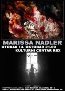 Kultna američka pevačica Marisa Nadler (Marissa) predstaviće svoj aktuelni album „July“ (Sacred Bones/Bella Union), ali i pesme iz svih faza karijere koja traje više od decenije. Uz Marissu će nastupiti i Džanel Lepin (Janel Leppin) (violončelo, sint & vokal).